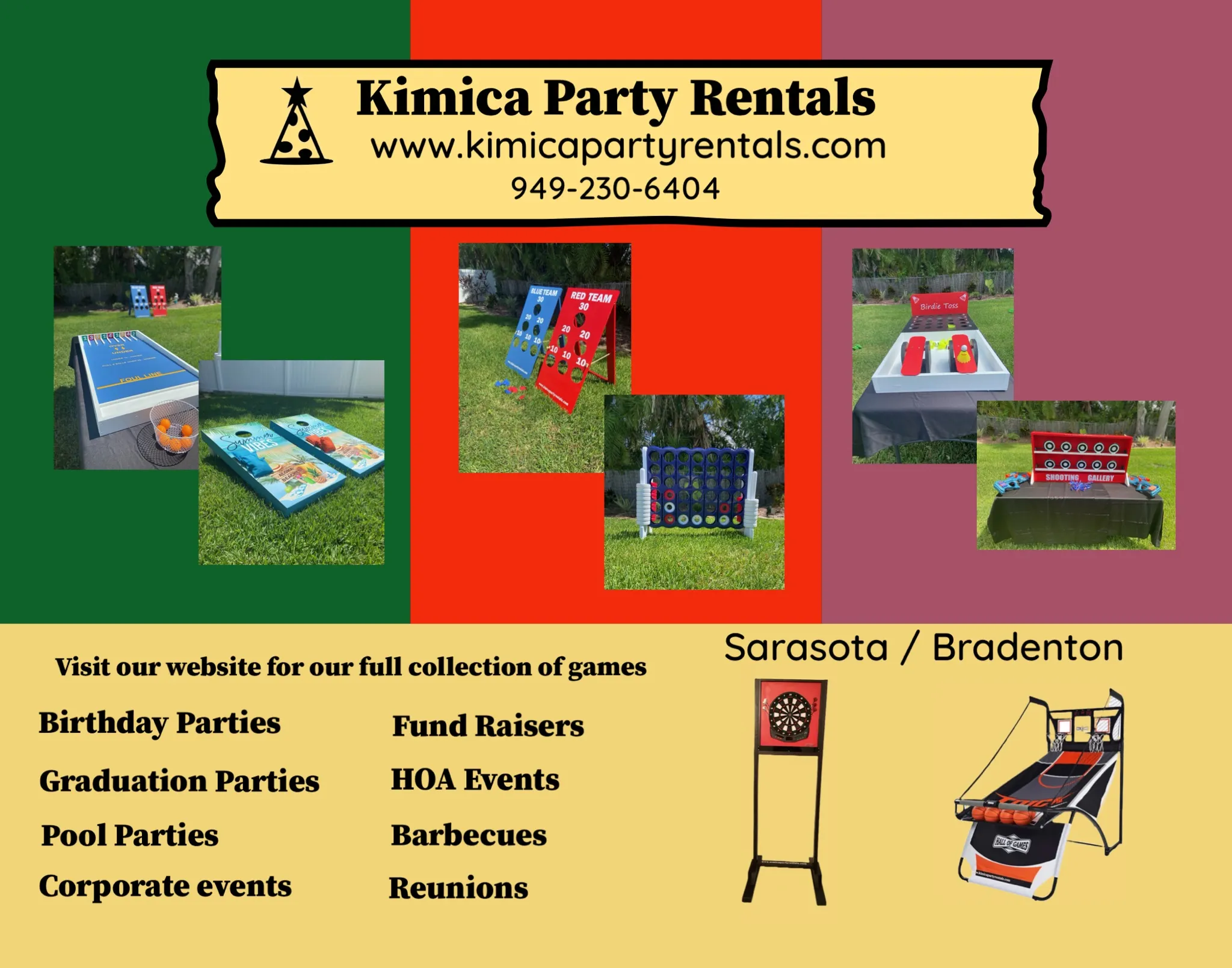 Damage includes, but is not limited to, tears, rips, scratches, dents, missing pieces, missing parts, missing instructions, permanent stains, cuts, gouges, burns, permanent aesthetic changes, holes, stickers, decals, confetti or glitter, any condition that hinders the functionality of the games and equipment, or any damage beyond normal wear and tear to be determined in the sole discretion of Kimica Party Rentals, LLC. Kimica Party Rentals, LLC will charge the card on file to replace damaged games and equipment caused by Lessee or Lessee’s agent.