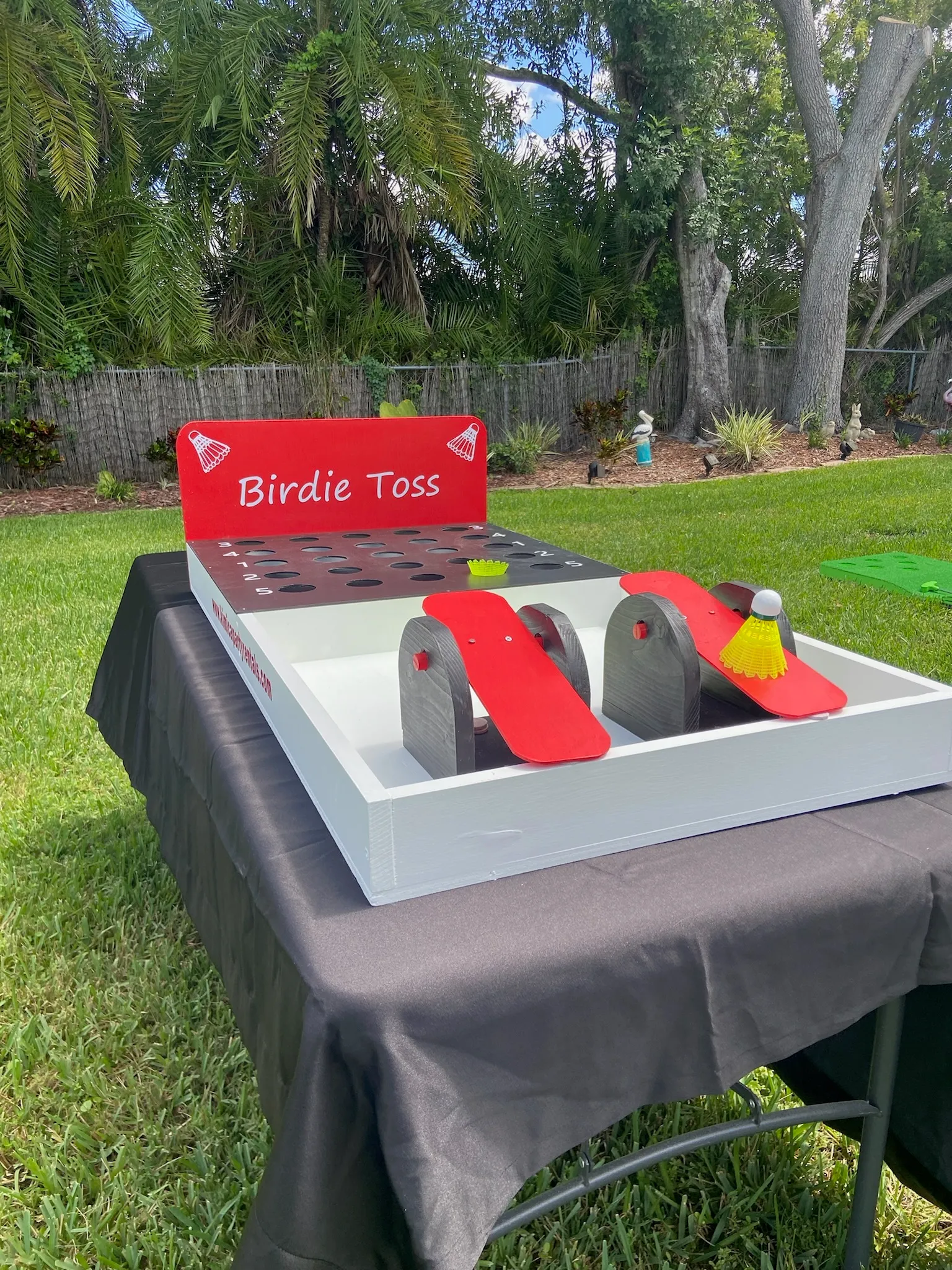Unleash the fun at your next event with Birdie Toss, the ultimate indoor/outdoor game that promises endless entertainment for all ages! Whether you're planning a family gathering, birthday party, or corporate event, Birdie Toss is your ticket to laughter and friendly competition. Birdie Toss is a delightful twist on the classic bean bag toss game, featuring brightly colored birdies to flip and soar through the air with every flip. The game board, adorned with points that adds a touch of friendly competition to any indoor / outdoor setting. Place on table to set up and simple to play, Birdie Toss is perfect for players of all skill levels. Renting Birdie Toss from our online store is a breeze. We offer flexible rental periods to suit your needs. Our game sets are meticulously cleaned and inspected before each rental, guaranteeing a pristine and enjoyable experience every time. Don't miss out on the chance to elevate your event with Birdie Toss. Reserve your set today and get ready to create unforgettable memories filled with smiles, cheers, and maybe even a little friendly rivalry!