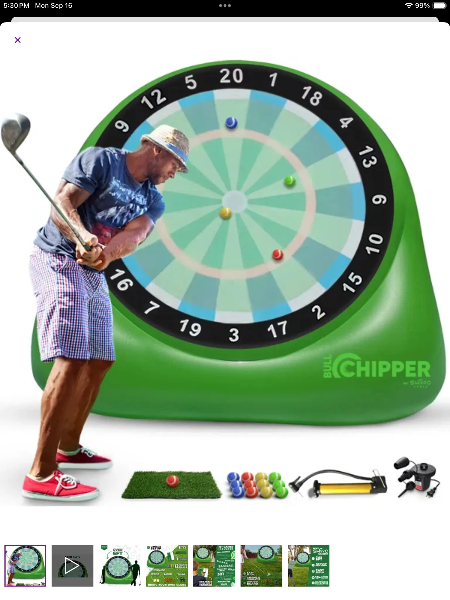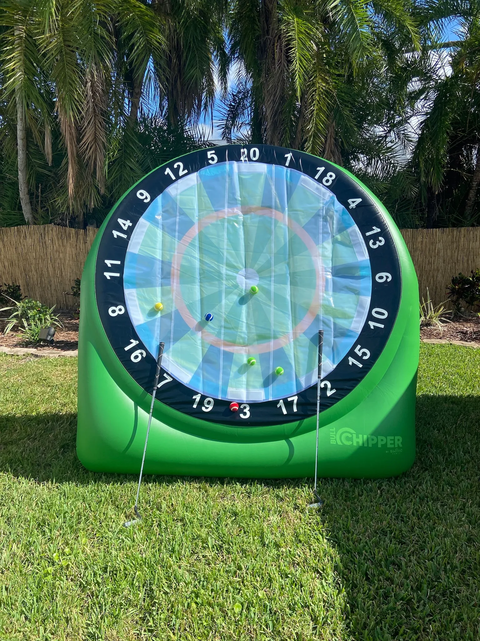 Simply have us set up the giant dartboard in your backyard or local park, grab our provided club and golf balls, and start aiming for the bullseye! Score points based on where your balls land and challenge your friends or family to see who can get the highest score.