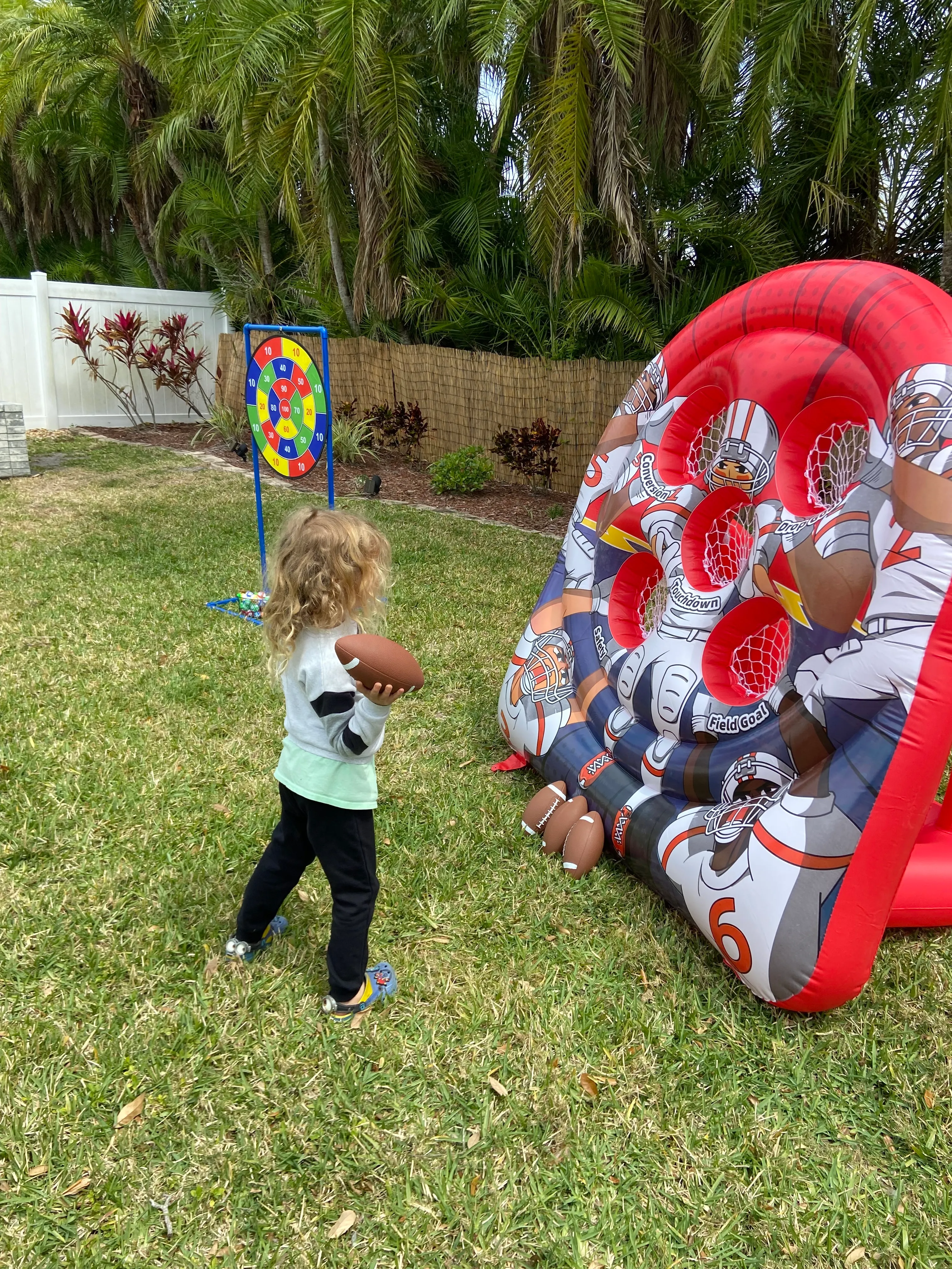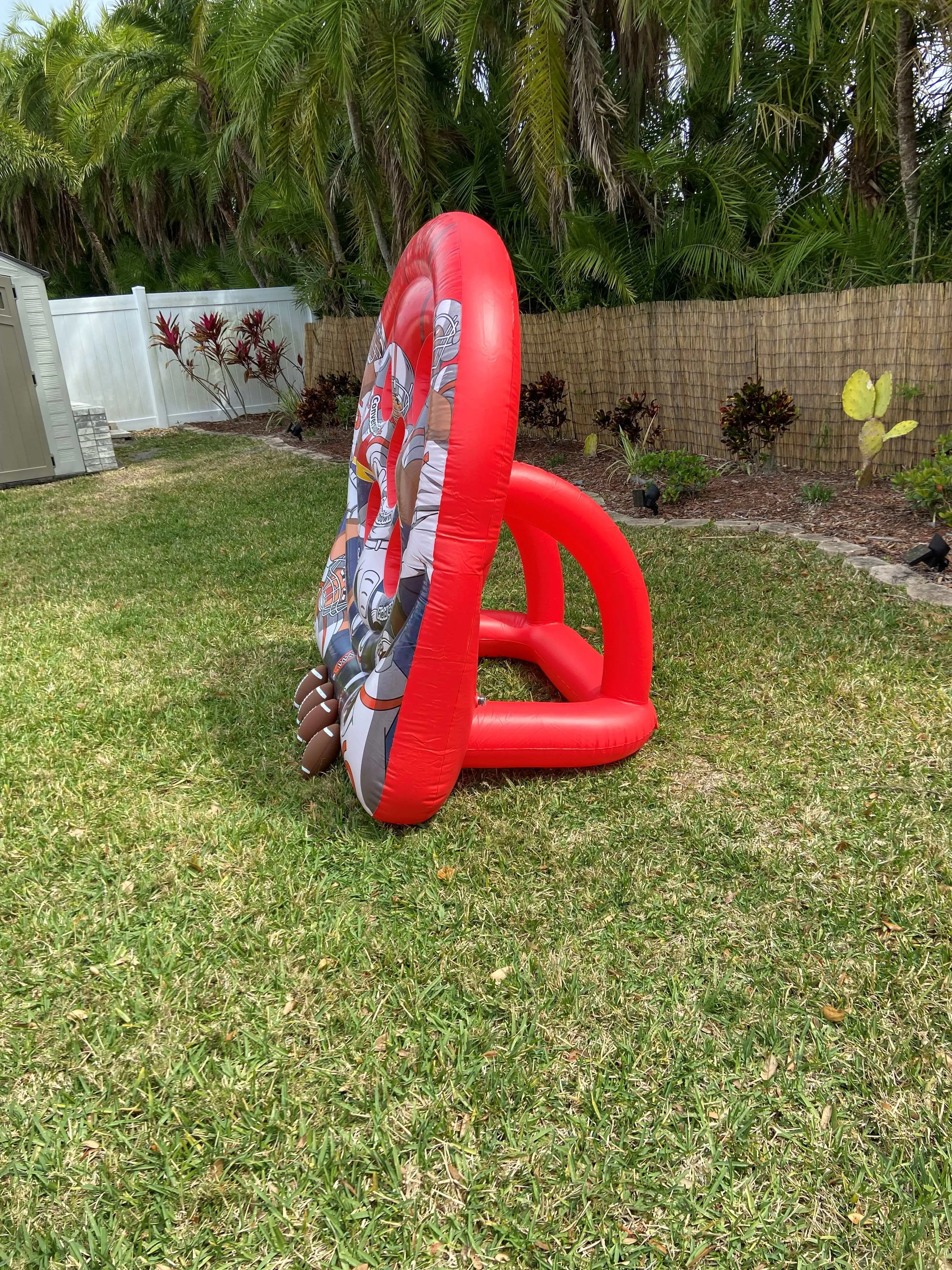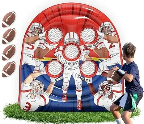Unleash the fun at your next event with our Inflatable Football Toss rental! Perfect for backyard parties, corporate events, school fairs, or any gathering that needs a touch of excitement, this inflatable game is a guaranteed crowd-pleaser. Standing tall and vibrant, the Inflatable Football Toss invites players of all ages to test their aim and precision. With multiple target holes, each offering a different point value, it challenges participants to outscore each other in a friendly competition. The sturdy, 6' high-quality material ensures safety and durability, while the bright colors and eye-catching design add a festive atmosphere to any occasion. Setup is a breeze with our easy-to-follow instructions, and our team is always on hand to assist if needed. Whether you’re hosting a sports-themed birthday party or a team-building event, this game is sure to be a hit. Watch as guests line up to show off their quarterback skills, creating memorable moments and plenty of laughter. Rent the Inflatable Football Toss today and turn your event into a touchdown celebration! Book now to secure this popular attraction and make your gathering an unforgettable experience.